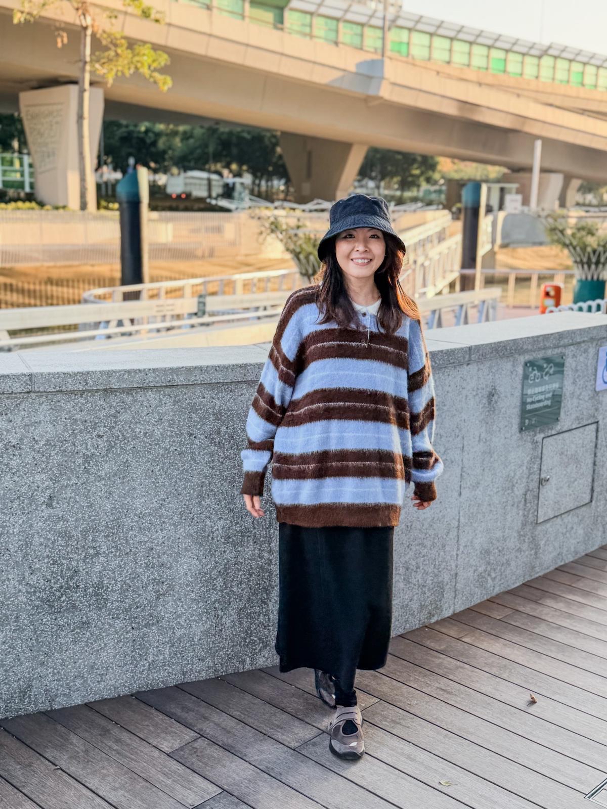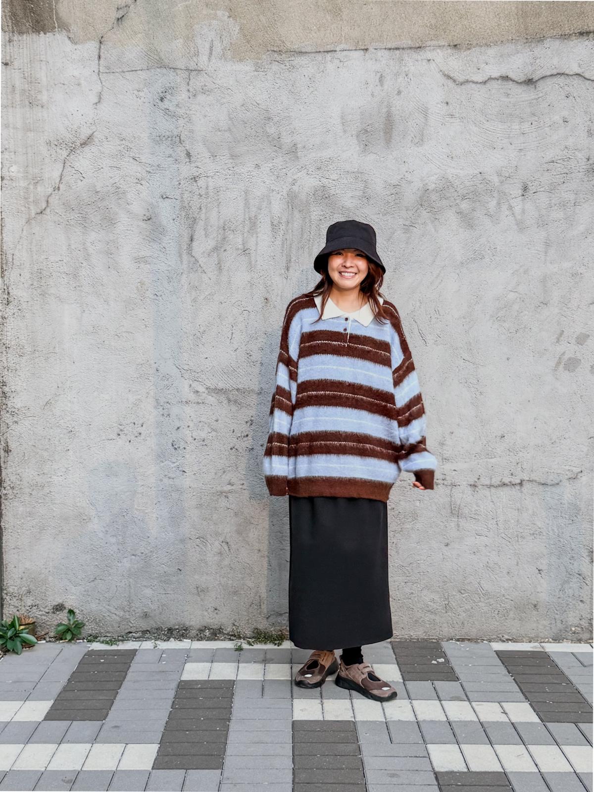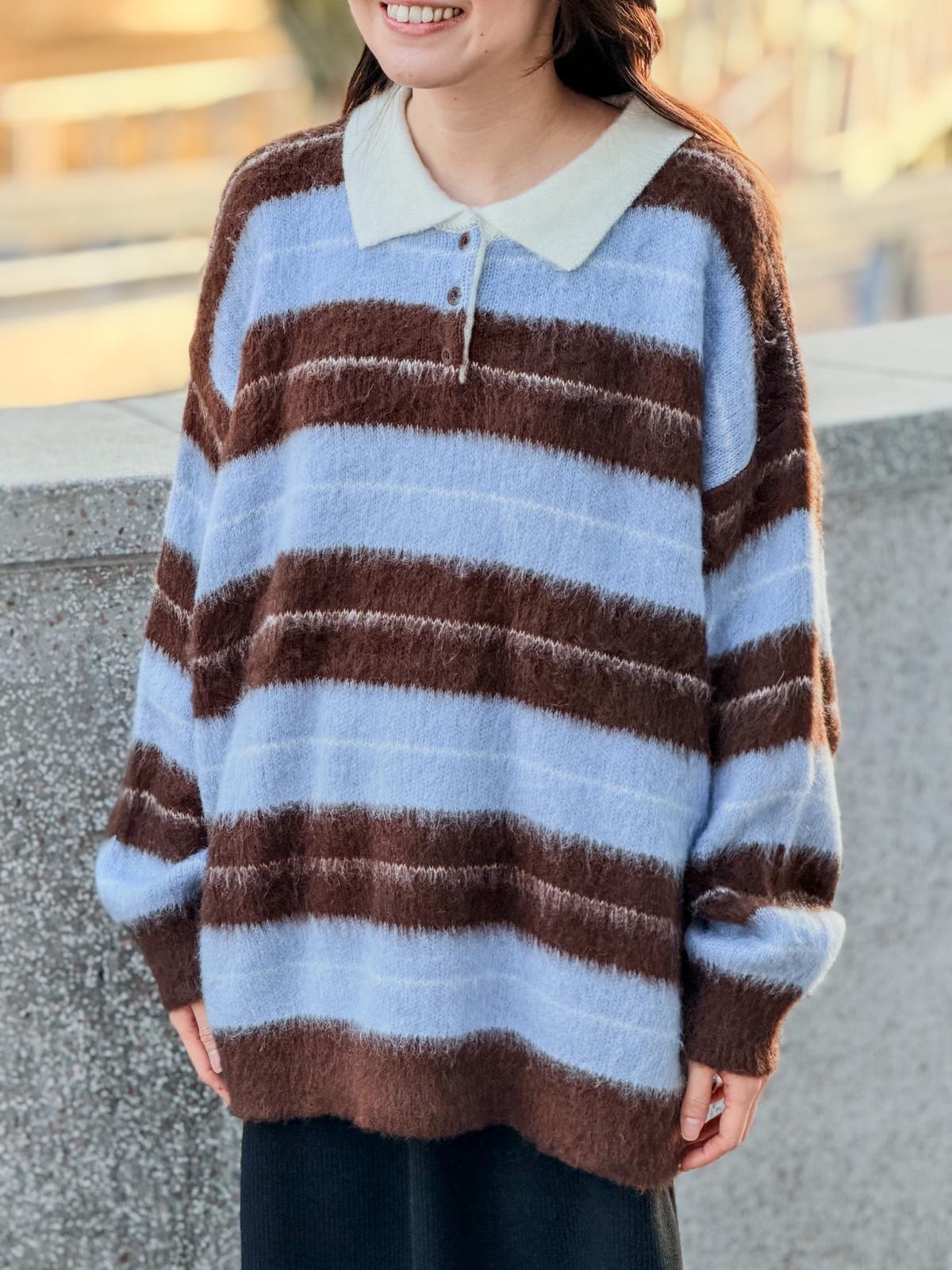 毛毛橫間polo上衣(淺藍啡間)