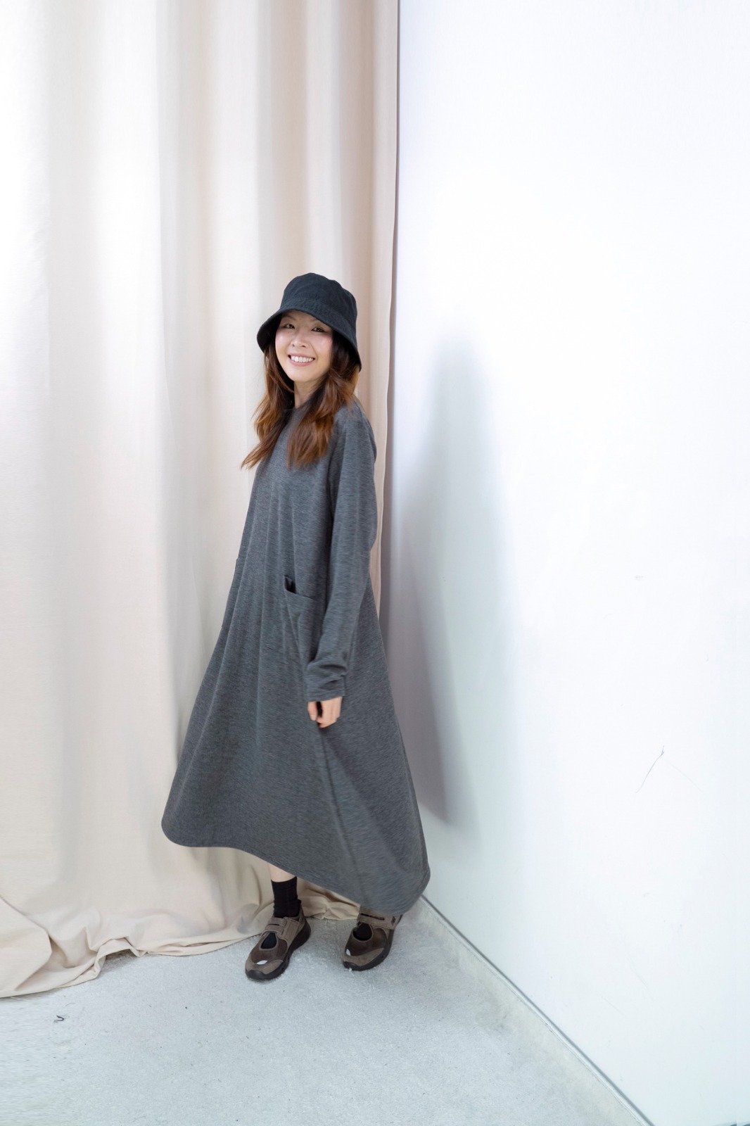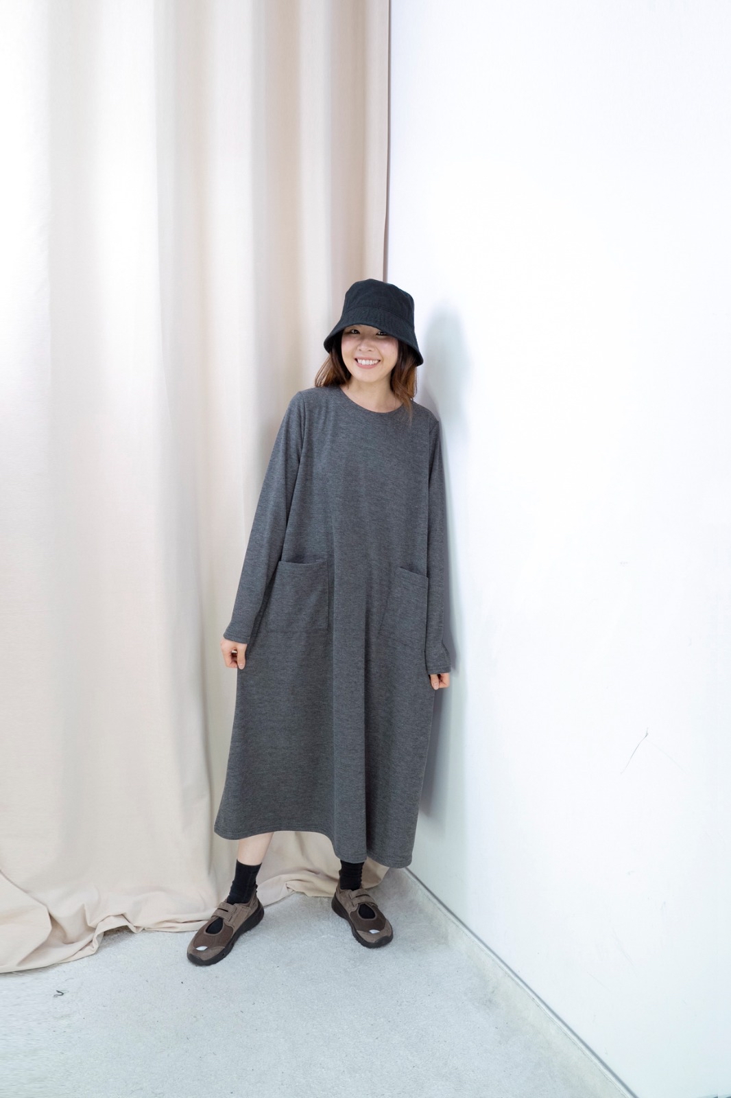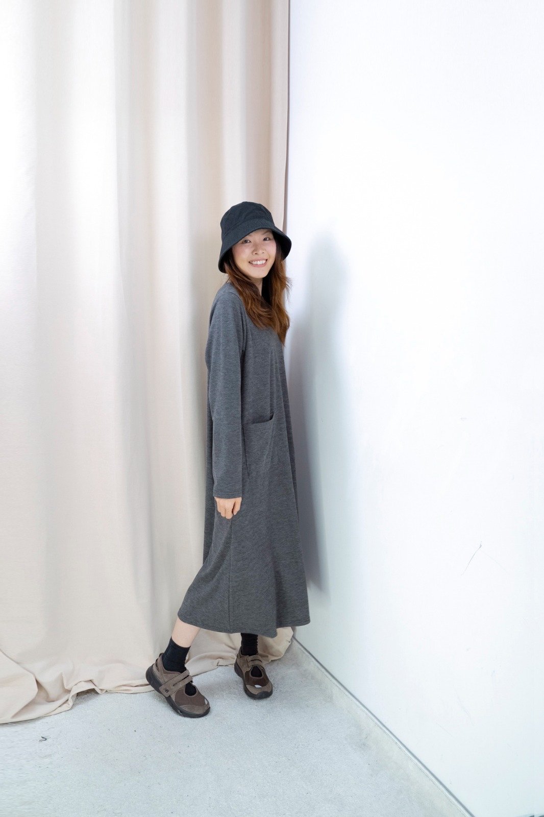 雙口袋順滑料連身裙(深灰色)